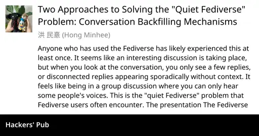 For Group-based apps, conversation backfill is mostly an issue for new instances, who might have a community’s posts (from its outbox), but will be missing old comments. Comments can be automatically and recursively retrieved when they are replied to or upvoted by a remote actor, but fetching from the source (as you arguably should do) is complicated by instances closing (there’s still loads of comments from