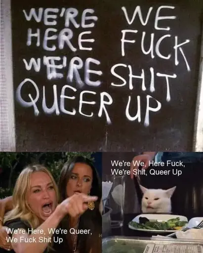 for some reason i read it as “we’re here, we fuck, we’re queer, shit up”