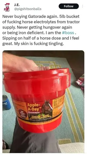 I’m guessing anything that provides electrolytes to horses probably has an absurb amount of potassium in it which is usually only put into human drinks in limited amounts cause it can be lethal. I read a story of some dude who drank 8 coconut waters while playing basketball, passed out, and his blood pressure at the ER was 65 over 40.